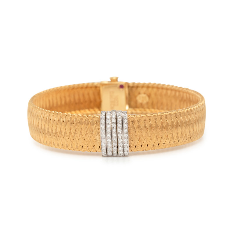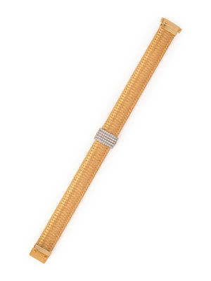 Consisting of a yellow gold mesh link bracelet measuring approximately 11.60 mm wide, with white gold section containing 55 round brilliant cut diamonds weighing approximately 0.40 carat total. 6 7/8 inches long.