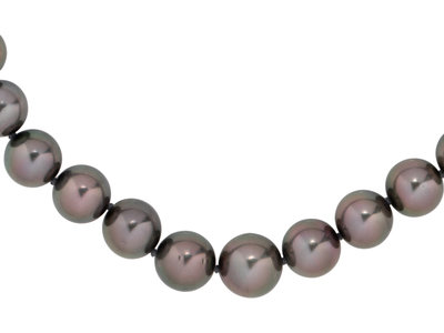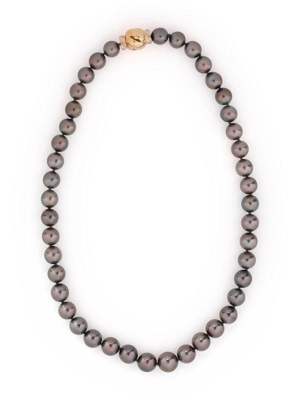 Containing pearls measuring approximately 9.25-11.40 mm in diameter, strung knotted with a yellow gold clasp containing 15 single cut diamonds. 18 1/2 inches long.
