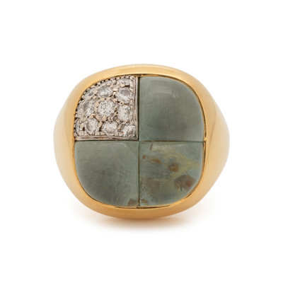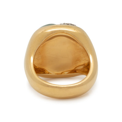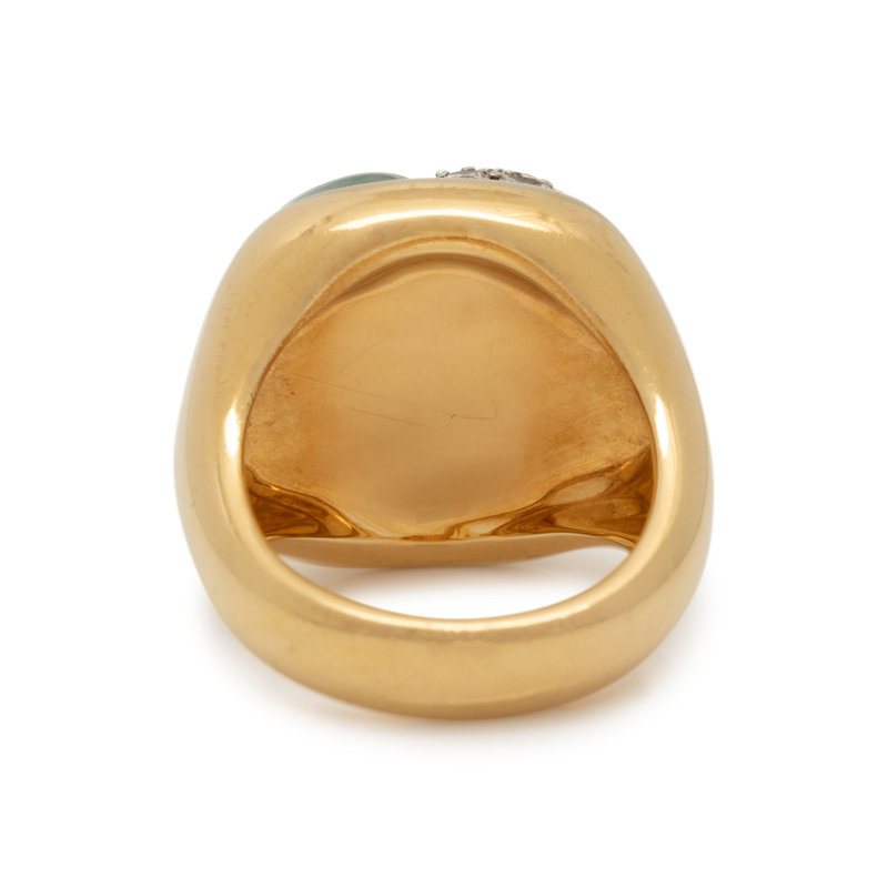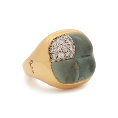 Containing three cabochon aquamarines and 13 round brilliant cut diamonds weighing approximately 0.50 carat total. Mounted in yellow gold. Ring size 7.