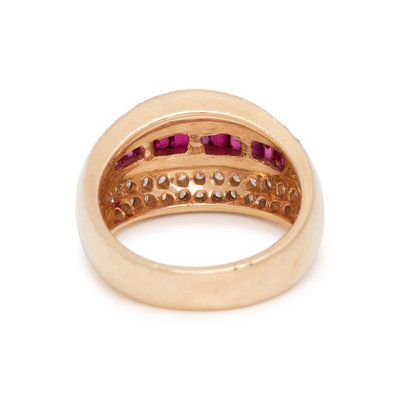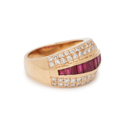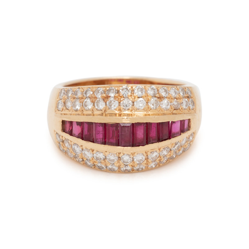Containing 11 baguette cut rubies and 52 round brilliant cut diamonds weighing approximately 1.00 carat total. Mounted in yellow gold. Ring size 6 1/2.