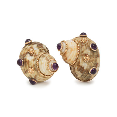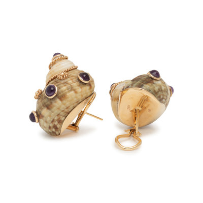 Containing two shells and eight round cabochon amethyst, posts with clip backs. Mounted in yellow gold. 1 1/8 inches long.