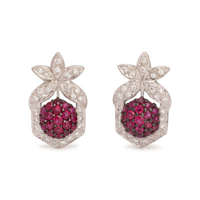 Containing 52 round brilliant cut diamonds weighing approximately 0.40 carat total and numerous round mixed cut rubies, folding posts with clip backs. Mounted in white gold. 7/8 inch long.