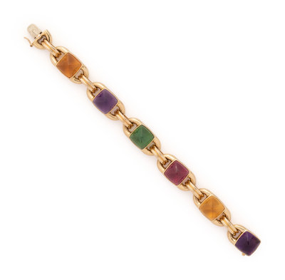 Containing six sugarloaf gemstones including citrine, amethyst, green tourmaline and pink tourmaline. 6 3/4 inches long.