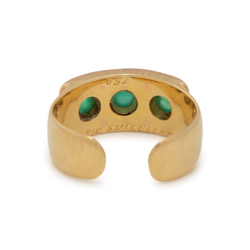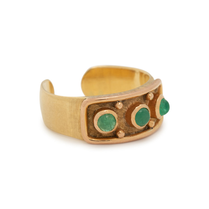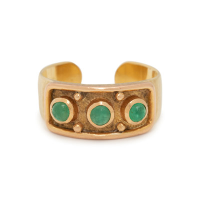 Containing three round cabochon emeralds with an open shank. Ring size 7.