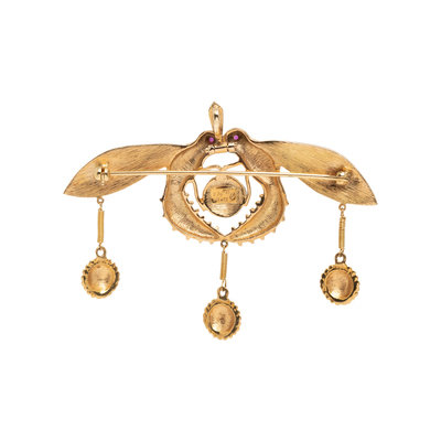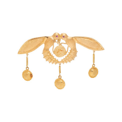 Designed as a textured gold replica of the Ancient Minoan 'Malia' pendant, with two ruby eyes. 1 5/8 x 2 1/2 inches.