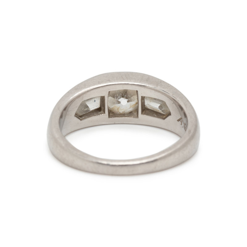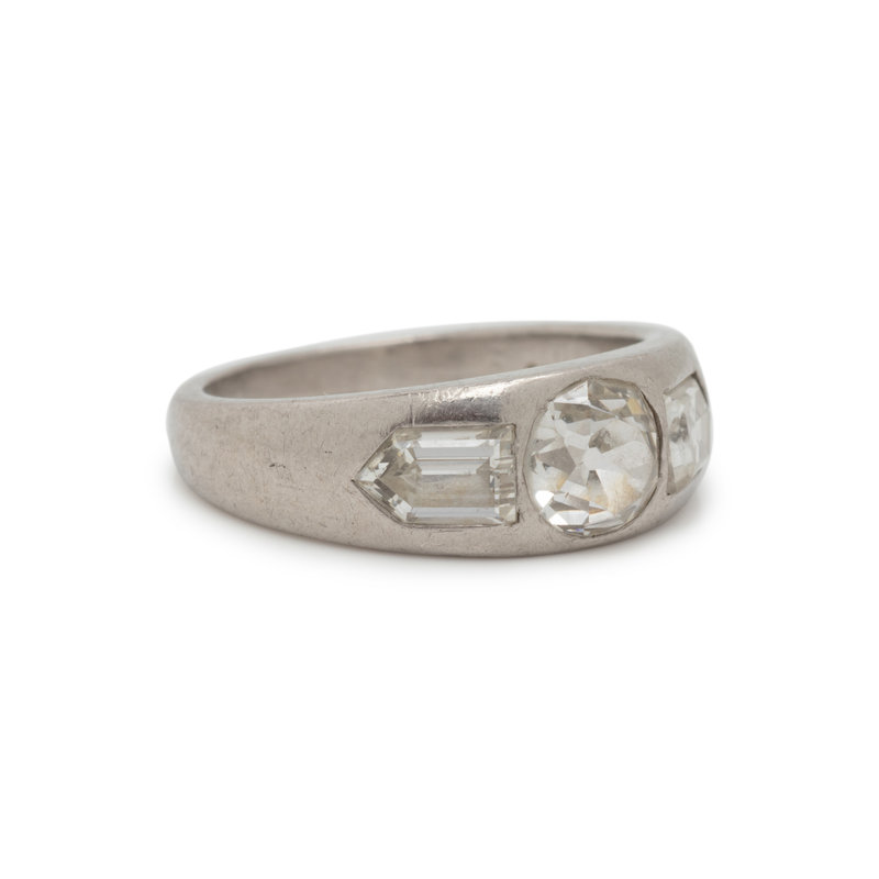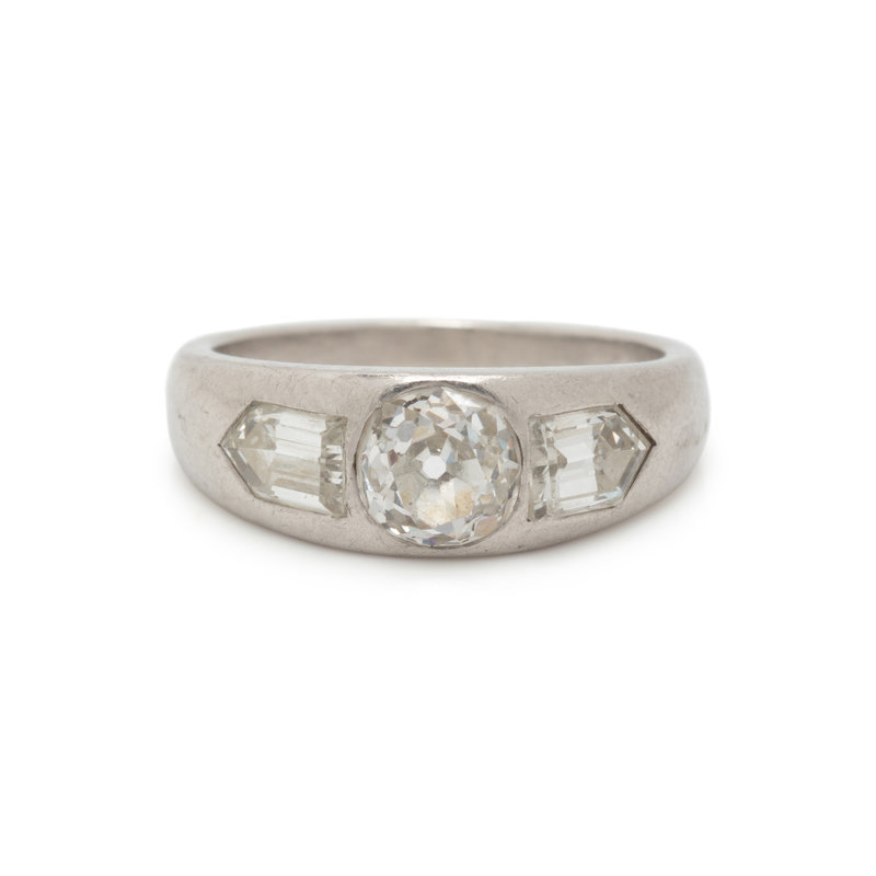 Containing one old mine cut diamond weighing approximately 0.40 carat and two step cut bullet shaped diamonds weighing approximately 0.50 carat total. Ring size 2 3/4.
