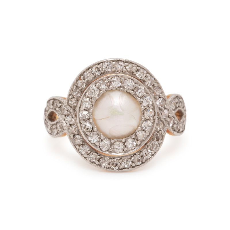 Containing one pearl (origin not tested) measuring approximately 6.00 mm in diameter and 58 old mine cut diamonds weighing approximately 0.60 carat total. Mounted in platinum-topped gold. Ring size 4 1/4.