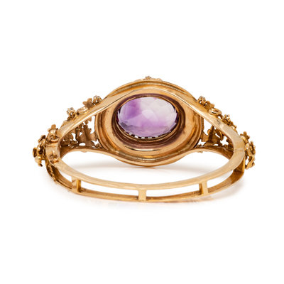 Containing one oval mixed cut amethyst measuring approximately 21.00 x 16.00 mm and 14 single cut diamonds. Mounted in yellow gold. 6 1/2 inches inner circumference.
