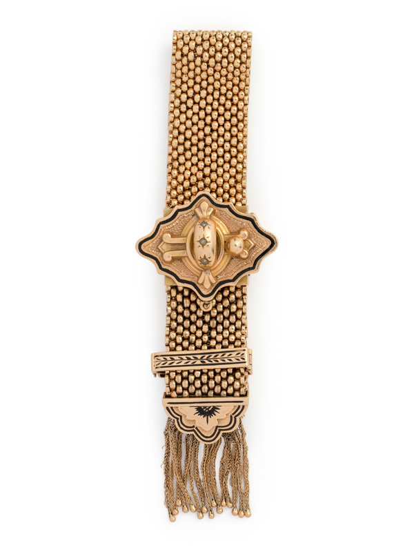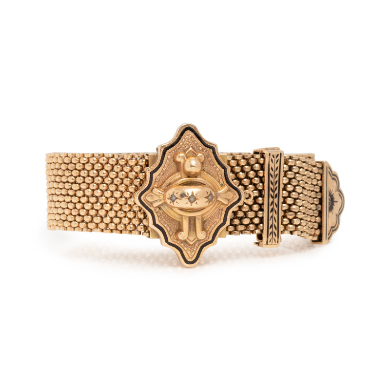 Consisting of a mesh link bracelet measuring approximately 18.50 mm wide, the slide clasp containing three seed pearls with enamel detail and wheat chain fringe. Up to 7 3/4 inches inner circumference.