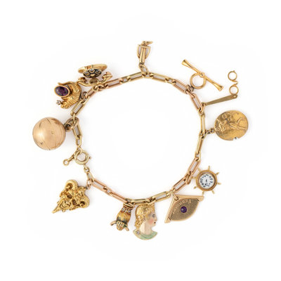 Consisting of a fancy link chain suspending a basketball charm engraved '1935', a cat charm, an articulated telephone charm, a stirrup and boot charm, a stylized horn charm, a lorgnette charm, baseball and golf charm, a nautical clock charm, a Cartier February birthstone charm, an enameled male profile charm, an owl charm and a grotesque face charm. 6 3/4-7 inches long.