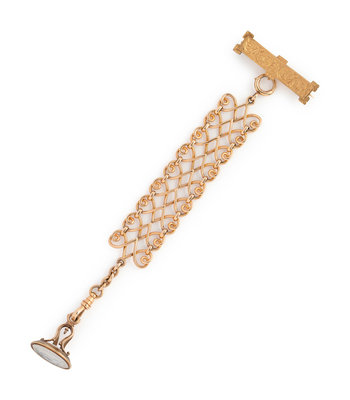 Consisting of a foliate engraved gold-filled bar brooch, suspending a rose gold fancy link fob chain with gold-filled pendant containing one oval hardstone intaglio. 6 3/4 inches long.