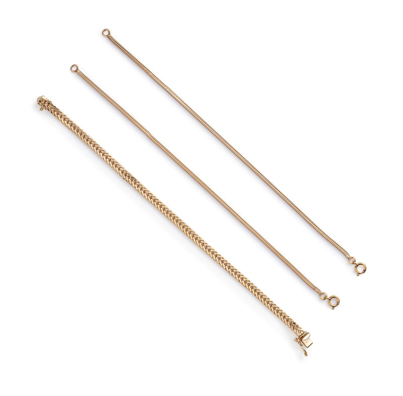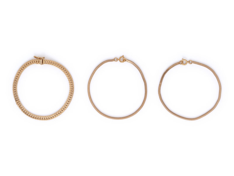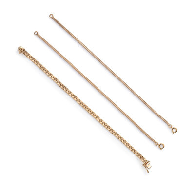 Consisting of a flattened foxtail link bracelet and two snake chain bracelets. 7 inches long.