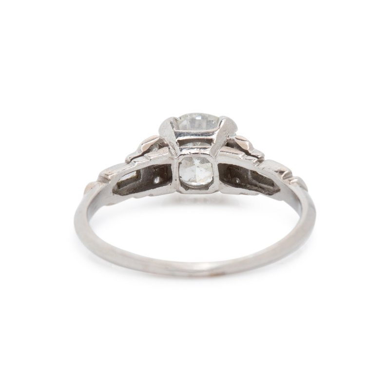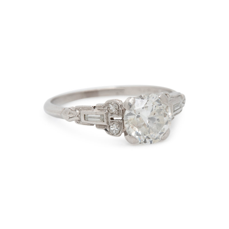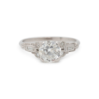 Containing one old European cut fracture-filled diamond weighing approximately 1.25 carats, four single and two baguette cut diamonds. Mounted in platinum. Ring size 6 1/4.