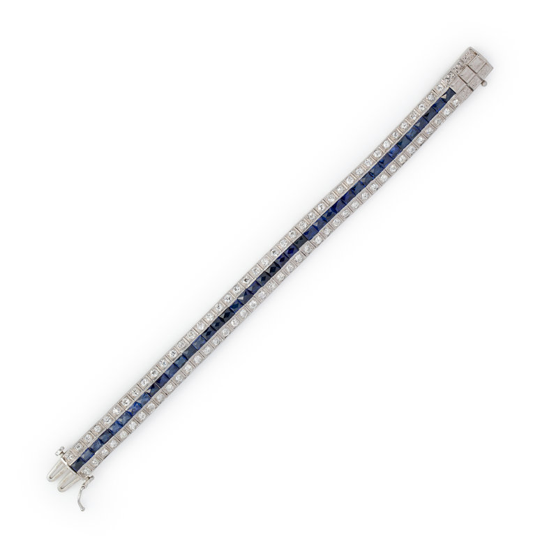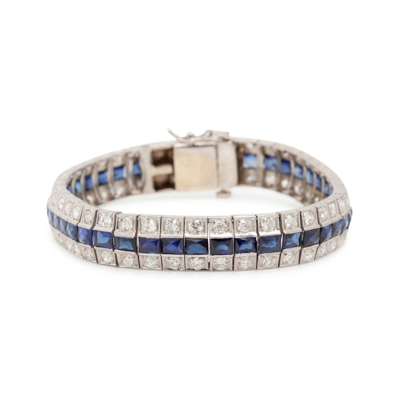 Containing 82 old European cut diamonds weighing approximately 5.30 carats total and 41 rectangular French cut synthetic sapphires. Mounted in platinum. 7 inches long.