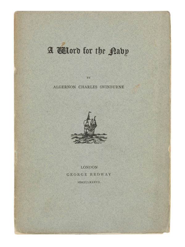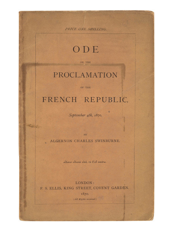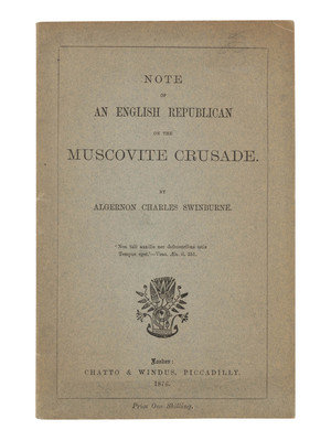 Ode on the Proclamation of the French Republic, September 4th 1870. London: F. S. Ellis, 1870. -- Auguste Vacquerie. Paris: Michel Levy, 1875. (Overall chipping.) -- Note of an English Republican on the Muscovite Crusade. London: Chatto & Windus, 1876. -- A Word for the Navy. London: George Redway, 1887. (Covers detached.) No. 50 of 250 copies. -- PHILLPOTTS, Eden. Swinburne. Port Hueneme, CA: John S. Mayfield, 1945.