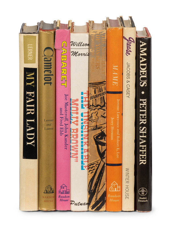 WILDER, Thornton. The Merchant of Yonkers. 1939. Autographed postcard signed (“TNW”) to Mrs. Carl P. Rollins’ wife of the printer for Yale University Press and designer of the Limited Editions Club Huckleberry Finn, and Tom Sawyer, Newport, 15 April 1962 laid in. -- LERNER, Alan Jay et al. My Fair Lady. 1956. -- WILLSON, Meredith et al. The Unsinkable Molly Brown. 1961. -- LERNER et al. Camelot. 1961. -- MASTEROFF, Joe et al. Cabaret. 1967. -- LAWRENCE, Jerome et al. Mame. 1967. ADVANCE REVIEW COPY with slip laid in. -- JACOBS, Jim et al. Grease. NY, 1972. -- SHAFFER, Peter. Amadeus. London, 1980. -- Together, 8 works in 8 volumes, most published in New York, various 8vo sizes, most illustrated, all in original cloth or quarter cloth, all in unrestored dust jackets (most unclipped), ALL FIRST EDITION, many FIRST ISSUE, condition generally fine.