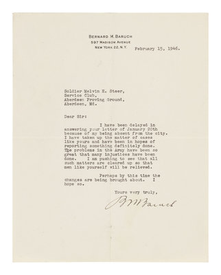 JAMES, William (1842-1910). Autograph letter signed ("Wm. James") to Henry Sturt. Cambridge, MA, 10 March 1903. 2 pages. To a colleague, thanking him for a copy of his book. -- MENCKEN, Henry Louis (1880-1956). Typed letter signed ("Mencken"). Baltimore, MD, 22 February 1929. 1 page. Feedback on a publication. -- BARUCH, Bernard M. (1870-1965). Typed letter signed ("BM Baruch") to Melvin E. Steer. New York, 15 February 1946. 1 page. The statesman writes to a soldier promising assistance. -- BEARD, Charles (1874-1948). Typed letter signed ("Charles A. Beard") to Mr. Garland. Pine Crest Inn, Tryon, NC, 7 February [1944?]. 1 page. The historian discusses his book The Republic and an article in Life. -- RUSSELL, Bertrand, 3rd Earl (1872-1970). Typed letter signed ("Bertrand Russell") to Jack Benjamin. Merioneth, Wales, 2 July 1964. -- WINDSOR, Wallis Simpson, Duchess of, (1896-1986). Autograph letter signed ("Wallis") to Martha Slater. Gif-sur-Yvette, France, 5 March n.y. 3 pages. The Duchess writes to a friend with travel and health updates. -- Together, 6 typed and autograph letters signed, various 4to and 8vo sizes, condition generally fine.