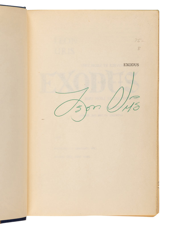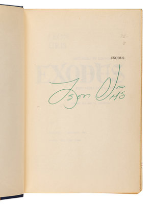 FIRST EDITION, SIGNED BY URIS on half-title in green ink. Uris' best-selling novel about founding the state of Israel was the basis for a 1960 film of the same name starring Paul Newman, Eva Marie Saint, Sal Mineo, and Peter Lawford.