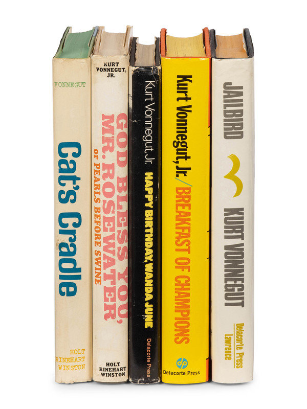 Cat's Cradle. New York, Chicago, and San Francisco: Holt, Rinehart and Winston, 1963. -- God Bless You, Mr. Rosewater...New York, Chicago, and San Francisco: Holt, Rinehart and Winston, 1965. -- Happy Birthday, Wanda June. New York: Delacorte, 1971. -- Breakfast of Champions. New York: Delacorte Press/Seymour Lawrence, 1973. -- Jailbird. New York: Delacorte Press/Seymour Lawrence, 1979. FIRST TRADE EDITION. INSCRIBED BY VONNEGUT. -- And 3 others. Together, 8 works in 8 volumes, 8vo, all in original bindings, all FIRST EDITIONS, a few with VONNEGUT'S SIGNATURE on a slip laid in, condition generally very fine.