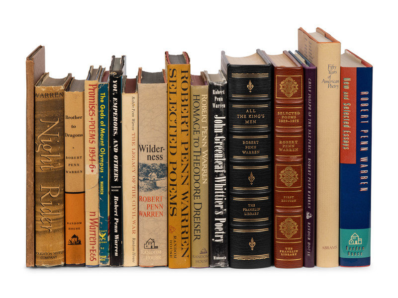 “The Fierce Horsemen,” in Driftwood Flames. Nashville, 1923. Original boards. LIMITED EDITION, 185 of 325. -- Night Rider. Boston, 1939. PRESENTATION COPY, INSCRIBED BY WARREN. -- Brother to Dragons. 1953. FIRST ISSUE. PRESENTATION COPY, INSCRIBED BY WARREN. -- Promises Poems 1954-1956. London, 1959. Original wrap-around band. -- The Gods of Mount Olympus. 1959. FIRST ISSUE. -- You, Emperors, and others Poems 1957-1960. 1960. FIRST ISSUE. REVIEW COPY. -- Wilderness a Tale of the Civil War. 1961. SIGNED BY WARREN. -- The Legacy of the Civil War. 1961. FIRST ISSUE. PRESENTATION COPY, INSCRIBED BY WARREN. -- Selected Poems: New And Old, 1923-1966. 1966. FIRST ISSUE. -- Homage to Theodore Dreiser. 1971. SIGNED BY WARREN. -- And 6 others. Together, 16 works in 16 volumes, various 8vo sizes, most published in New York by Random House, most in original cloth or quarter cloth, most in unrestored and unclipped dust jackets, ALL FIRST EDITION, condition generally fine. Complete list available upon request. [With:] Mountain Mystery. Palaemon Press, 1981. Broadside. One of 126 copies SIGNED. -- Another copy. -- Cycle. 1980. Broadside. -- Little Girl Wakes Early. Palaemon Press, 1984. Broadside.