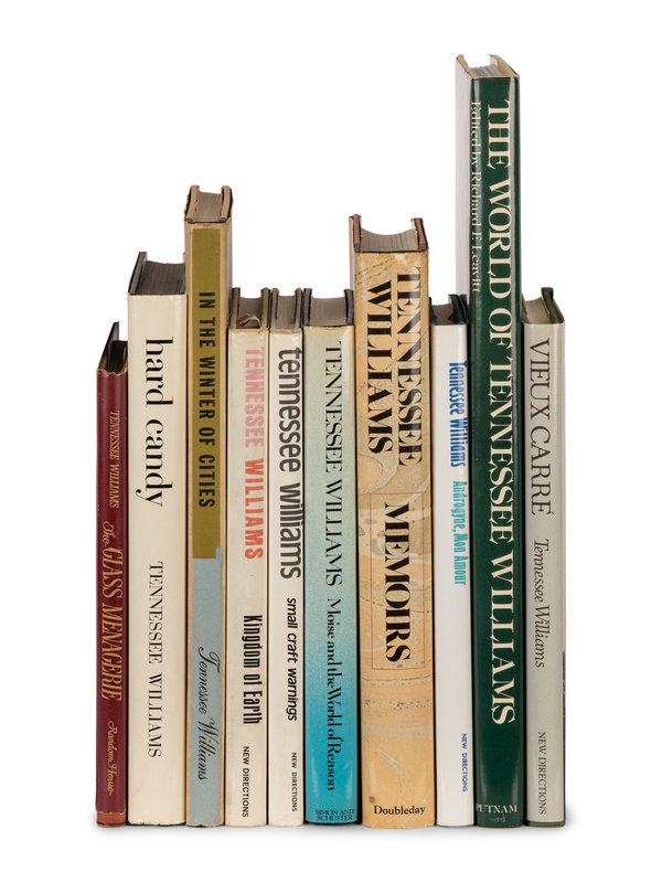 The Glass Menagerie. NY, 1945. Provenance: William Targ (1907-1999), American book editor (signature). -- In the Winter of Cities. NY, 1956. -- Hard Candy. NY, 1959. Later edition, SIGNED. -- Kingdom of Earth. NY, 1968. -- Small Craft Warnings. NY, 1970. SIGNED. -- Memoirs. Garden City, NY, 1975. SIGNED. -- Moise and the World of Reason. NY, 1975. SIGNED. -- The World of Tennessee Williams. NY, 1978. SIGNED. -- Androgyne, Mon Amour. NY, 1977. SIGNED. -- Vieux Carre. NY, 1979. -- and 27 others. Together, 37 works in 37 volumes, various 4to and 8vo sizes, in original bindings and dust jackets, most FIRST EDITIONS, several SIGNED BY WILLIAMS, condition generally fine.