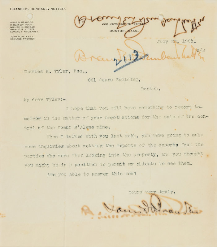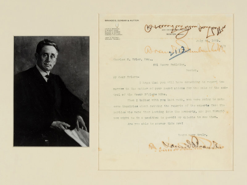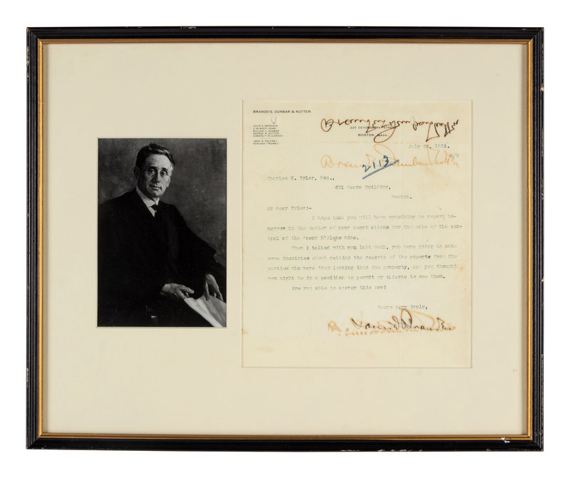 BRANDEIS, Louis Dembitz (1856-1941). Typed letter twice signed ("Louis D. Brandeis," "Brandeis, Dunbar & Nutter") to Charles H. Tyler. Boston, MA, 23 July 1901. 1 page, 4to, on Brandeis, Dunbar & Nutter letterhead, offsetting, toning, framed with a photographic print of Brandeis, not examined out of frame.