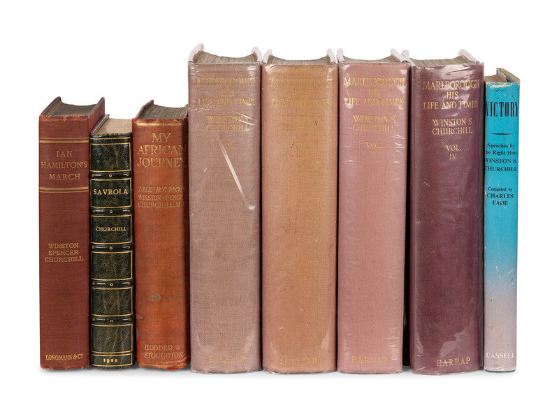 Savrola A Tale of the Revolution in Laurania. London: Longmans, Green, and Co., 1900. Contemporary green morocco gilt, stamp-signed by Bayntun. FIRST ENGLISH EDITION of Churchill's only novel. Woods A3(b). -- Ian Hamilton's March. London: Longmans, Green, and Co., 1900. With frontispiece and folding map. FIRST EDITION. Woods A5. -- My African Journey. London: Hodder and Stoughton, 1908. 3 maps and 47 photographic plates including frontispiece. (Heavy vertical crease to front board, small stains, spine darkened). FIRST EDITION. Woods A12. -- Marlborough His Life and Times. London: George G. Harrap & Co. Ltd., 1933-1938. 4 volumes. (Some discoloration to cloth). FIRST TRADE EDITION. Woods A40(a). -- EADE, Charles (1903-1964), compiler. Victory War Speeches by the Right Hon. Winston S. Churchill. London: Cassell and Company, Ltd., 1946. In unrestored and unclipped dust jacket (fading as typical, light creasing). FIRST EDITION with page 177 misprinted as 77. Woods A112. -- Together, 5 works in 8 volumes, 8vo, all in publisher's bindings except where noted, all in very good to fine condition except where noted.