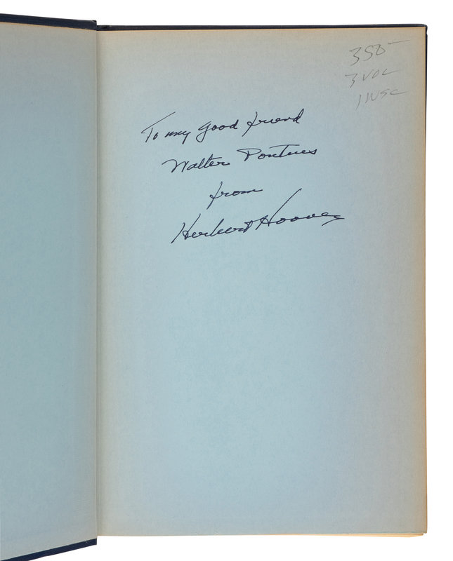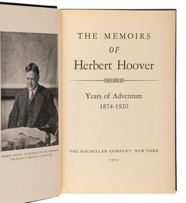 A Remedy for Disappearing Game Fishes. New York: Huntington Press, 1930. LIMITED EDITION, numbered 68 of 990. -- Hoover After Dinner: Addressed Delivered by Herbert Hoover. New York and London: Charles Scribner's Sons, 1933. -- MYERS, William Starr (1877-1956) and Walter H. Newton (1880-1941). The Hoover Administration. New York and London: Charles Scribner's Sons, 1936. -- The Memoirs of Herbert Hoover. New York: The MacMillan Company, 1951-1952. -- The Ordeal of Woodrow Wilson. New York, Toronto, and London: McGraw-Hill Book Company, Inc., 1958. -- And 3 others. Together, 8 works in 10 volumes, 8vo, all in original bindings, ALL FIRST EDITION, most SIGNED OR INSCRIBED BY HERBERT HOOVER, condition generally fine. Complete list available upon request.