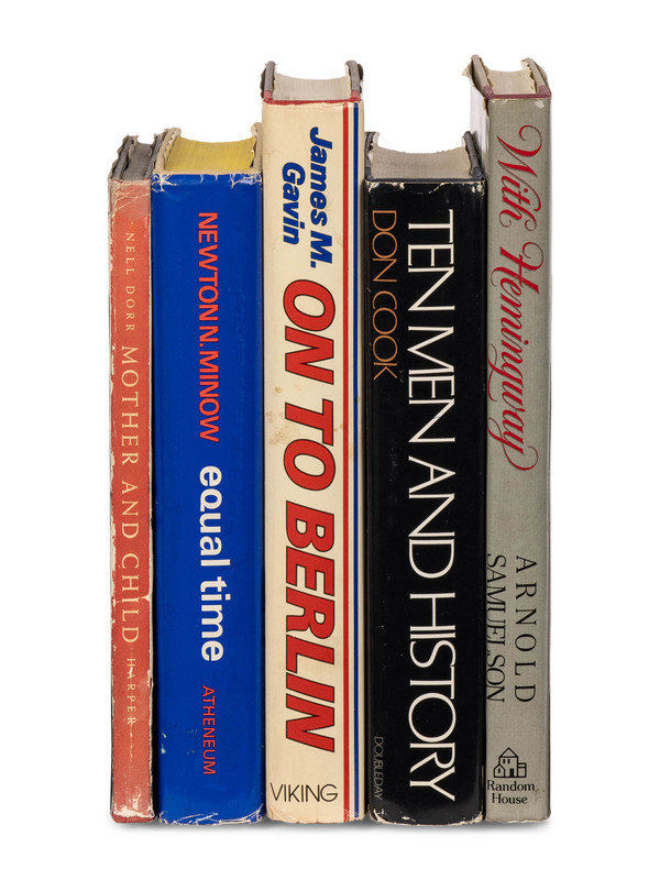 DORR, Nell (1893-1988). Mother and Child. New York: Harper & Brothers, 1954. INSCRIBED TO JACQUELINE KENNEDY BY THE AUTHOR. -- MINOW, Newton N. Equal Time: The Private Broadcaster and the Public Interest. NY: Atheneum, 1964. INSCRIBED TO JACQUELINE KENNEDY BY THE AUTHOR. -- GAVIN, James M. On to Berlin: Battles of an Airborne Commander, 1943-1946. New York: The Viking Press, 1978. -- COOK, Don. Ten Men and History. Garden City, NY: Doubleday & Company, Inc., 1981. -- SAMUELSON, Arnold. With Hemingway: A Year in Key West and Cuba. New York: Random House, 1984. SIGNED BY ONASSIS to the front free endpaper. -- Together, 5 works in 5 volumes, 8vo, in original bindings, all FIRST EDITIONS, condition generally fine. Provenance for the lot: Jacqueline Kennedy Onassis (sold Sotheby’s New York, 23-26 April 1996, The Estate of Jacqueline Kennedy Onassis, with bookplates).