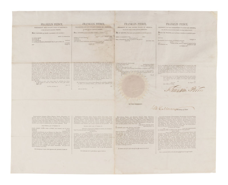 PIERCE, Franklin (1804-1869). Four-language ship's paper signed ("Franklin Pierce"). N.p., n.d. 1 page, 560 x 442 mm, with intact seal, matted with contemporary engraving of Pierce by Alonzo Chappel, old creases, minor soiling, neatly joined at crease to verso.
