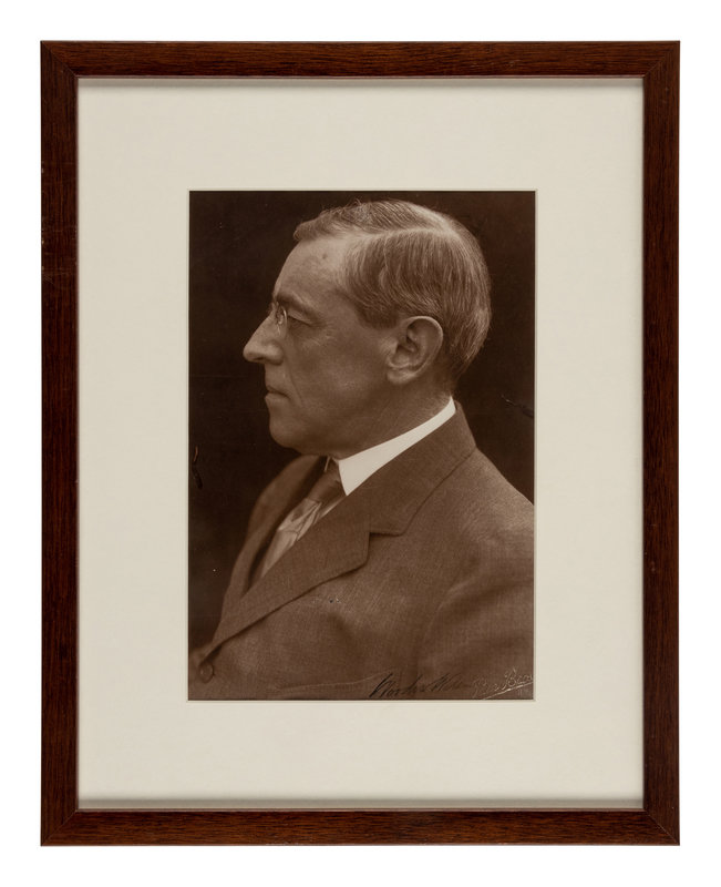 WILSON, Woodrow (1856-1924). Three-quarter length portrait signed ("Woodrow Wilson"). New York: Pach Brothers, n.d. -- ROOSEVELT, Franklin Delano (1882-1945). Document signed ("Franklin D. Roosevelt"), as Assistant Secretary of the Navy. US.S. Rhode Island, 1916. -- TRUMAN, Harry S. (1884-1972). Typed letter signed ("Harry S. Truman") to F. Ryan Duffy. Kansas City, MO, 10 December 1955. Framed with stipple engraving of Truman. -- JOHNSON, Lyndon Baines (1908-1973) and Claudia Alta Taylor "Lady Bird" JOHNSON. Black and white photograph signed ("Lyndon B. Johnson," "Lady Bird Johnson"), framed with Bess ABELL. Typed letter signed ("Bess Abell"), as the Johnson's social secretary. Washington, D.C., 10 October 1968. 1 page, 8vo, on White House letterhead. -- CLINTON, William Jefferson (b. 1946). The 1992 Presidential Debate program signed ("Bill Clinton"), framed with ticket for the Third Presidential Debate. [Lansing, MI], 19 October 1992. -- Together, 5 signed items, all framed, not examined out of frames, all in very fine condition.