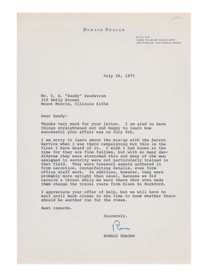 1 page, 4to, on Ronald Reagan letterhead. Reagan writes to a supporter and apologizes on behalf of the Secret Service for an unnamed faux pas. He notes that "they were probably more uptight than usual, because we did receive a threat while we were there that even made them change the travel route from Dixon to Rockford."