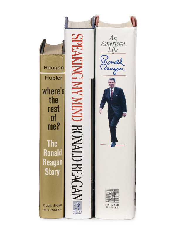 [With:] REAGAN, Ronald and Richard G. Hubler. Where's the Rest of Me? New York: Duell, Sloan and Pearce, 1965. -- Speaking My Mind: Selected Speeches. New York: Simon and Schuster, 1989. -- An American Life. New York: Simon and Schuster, 1990. -- Together, 3 works in 3 volumes, 8vo, in original bindings, ALL FIRST EDITIONS SIGNED BY RONALD REAGAN, condition generally fine.