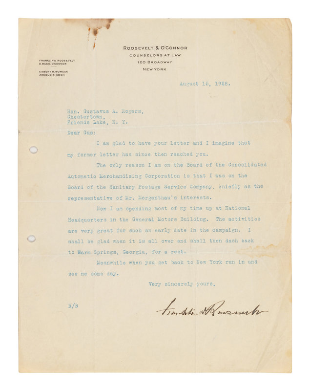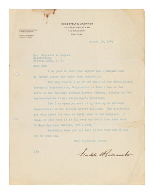 1 page, 4to, on Roosevelt & O'Connor letterhead, old creases, some stains. Roosevelt writes to the Democratic Party organizer regarding his involvement in several organizations and the gubernatorial campaign. He notes, "I shall be glad when it is all over and shall then dash back to Warm Springs, Georgia, for a rest."