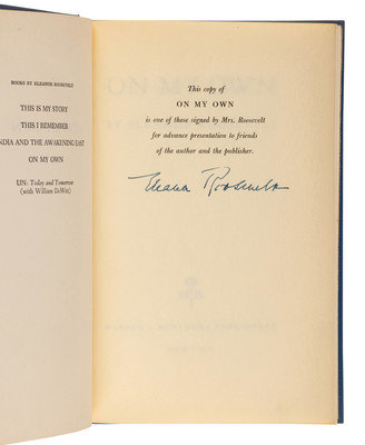On My Own. New York: Harper & Brothers, 1958. FIRST EDITION, ADVANCE PRESENTATION COPY SIGNED BY ELEANOR ROOSEVELT. -- This is My Story. New York and London: Harper & Brothers, 1937. SIGNED BY ELEANOR ROOSEVELT. -- Christmas. New York: Alfred A. Knopf, 1940. SIGNED BY ELEANOR ROOSEVELT. -- This I Remember. New York: Harper & Brothers, 1949. SIGNED BY JAMES ROOSEVELT. -- India and the Awakening East. New York: Harper & Brothers, 1953. Provenance: Emerson J. Griffith (presentation inscription, bookplate). INSCRIBED BY ELEANOR ROOSEVELT. -- And 2 others. Together, 7 works in 7 volumes, various 8vo sizes, in original bindings, ALL FIRST EDITIONS, condition generally fine.