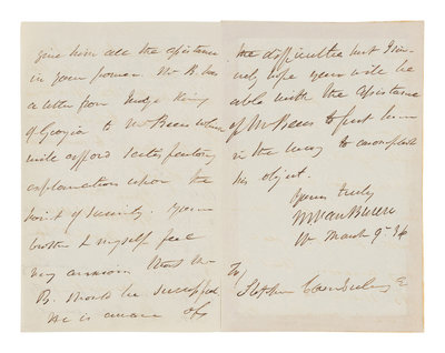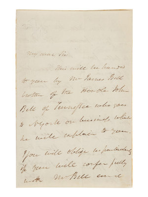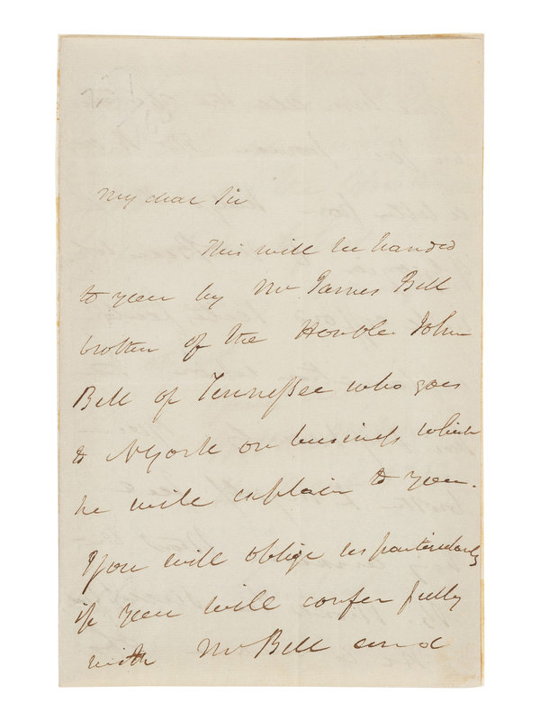 3 pages, 8vo, short separation at crease, modern cardstock frame affixed to rear panel. A letter of introduction for James Bell of Tennessee who was traveling to New York "on business." The recipient was the brother of Churchill Camberling, a member of the U.S. House of Representatives from New York and well connected in New York society.