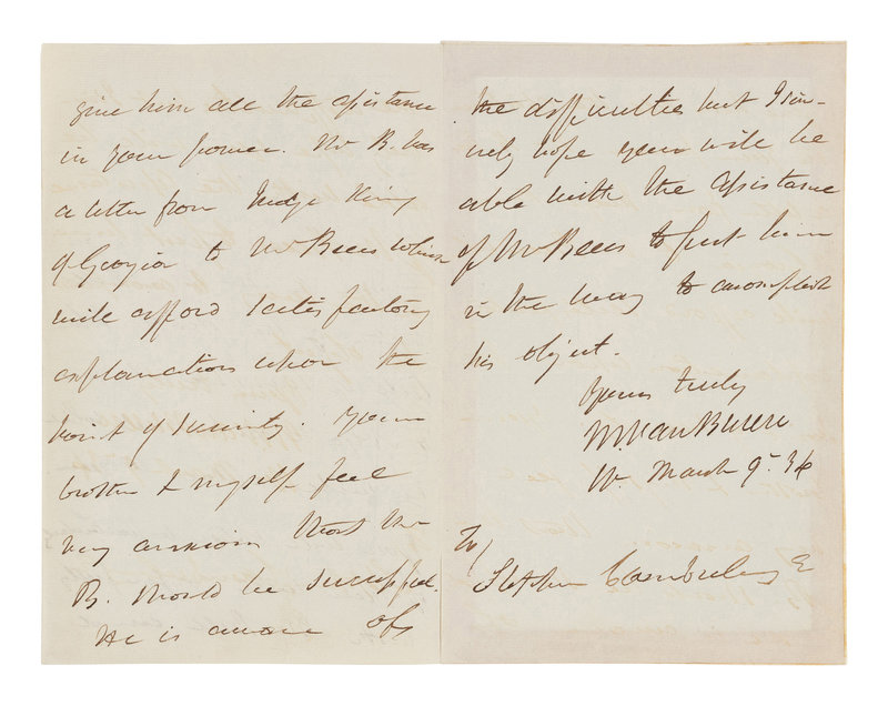 VAN BUREN, Martin (1782-1862). Autograph letter signed ("M. Van Buren"), as Vice President, to Stephen Camberling (ca 1790-1872). Washington, D.C., 9 March 1834.