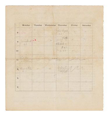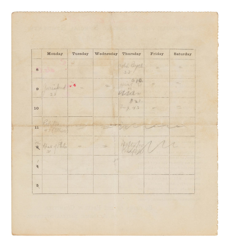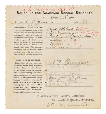 Partly printed document signed. “Schedule for Academic Special Students.” [Princeton University], 1904-1905. 139 x 150 mm partly printed document (minor toning), SIGNED BY WOODROW WILSON as a Princeton professor.