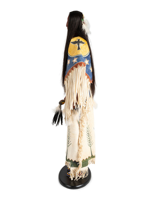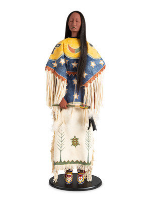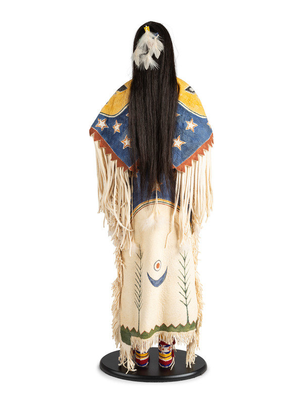, 2005elegant female figure wearing a softly tanned hide dress painted with stars, moon, and thunderbirds; beaded leggings and moccasins