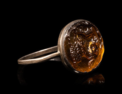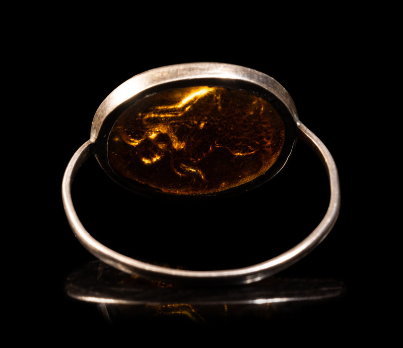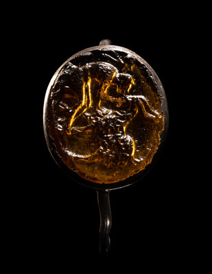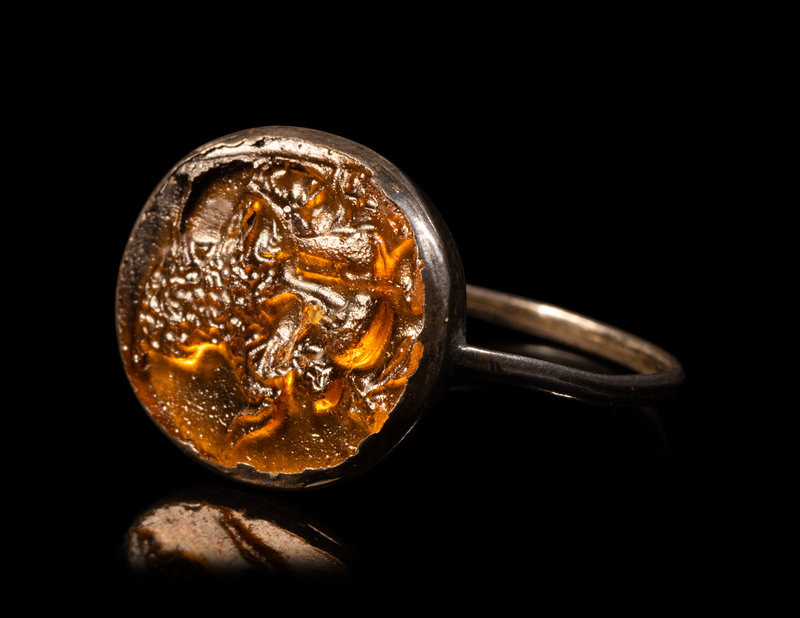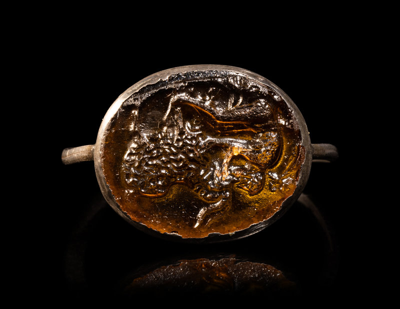 A Roman Silver and Glass Finger Ring of a Satyr Kissing a Goat