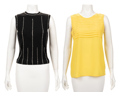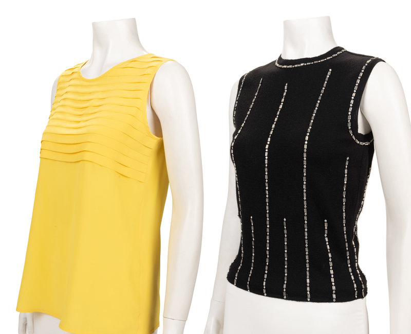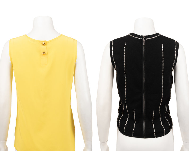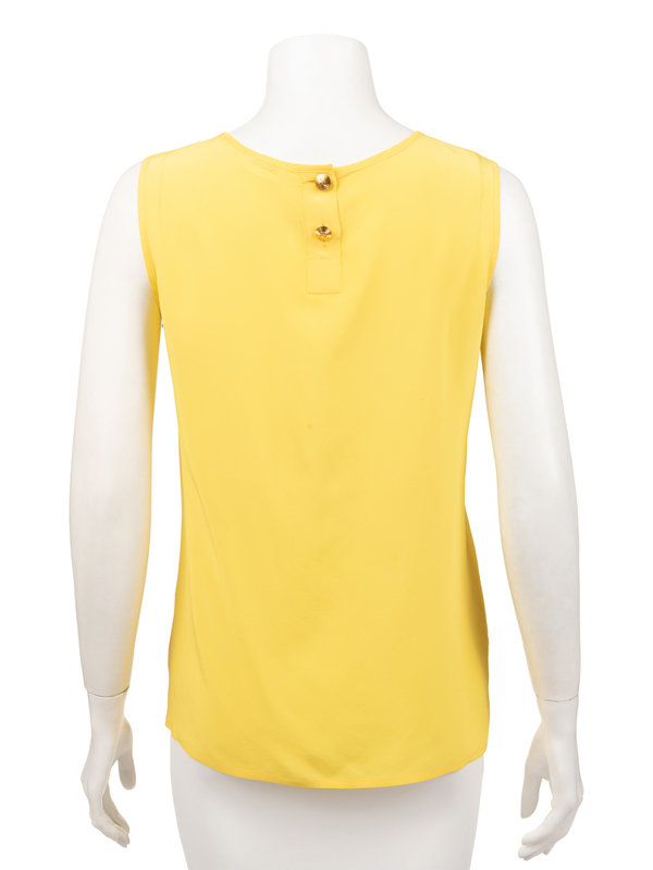 Yellow silk crepe sleeveless top with pleated upper bodice and back button closure.