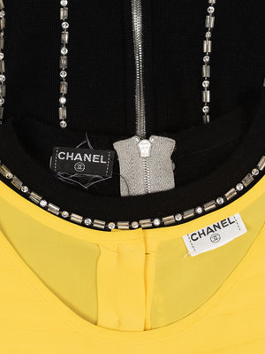 Black cashmere and silk knit sleeveless top with silver rhinestone strips and center back zipper closure.