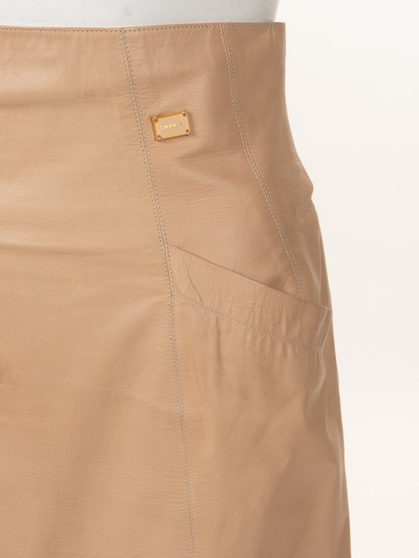 Kaki calfskin leather skirt with pleated hemline and back zipper closure. Fall 2001.