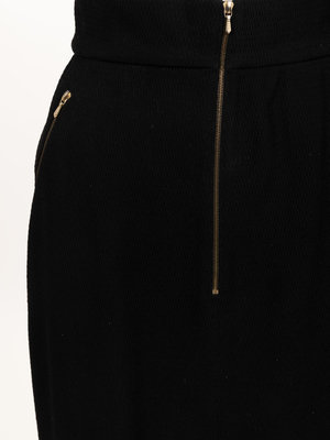 Black wool/nylon blend long pencil skirt with two zipper pockets and a back zipper slit.