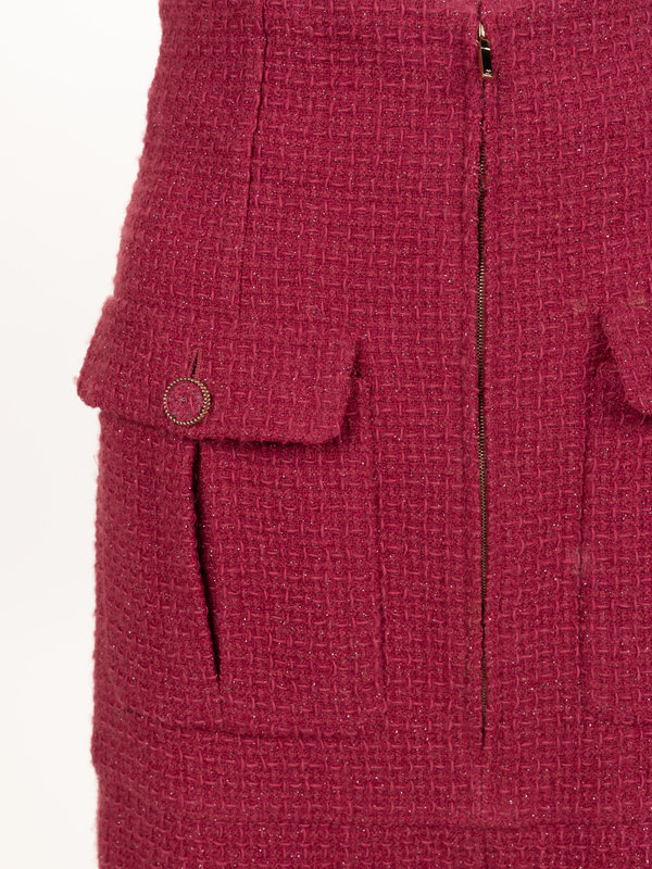 Fuchsia wool/nylon blend pencil skirt with two front pockets and a front zip closure, as well as two side zipper slits.