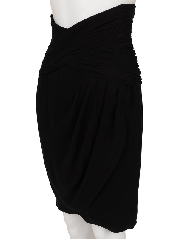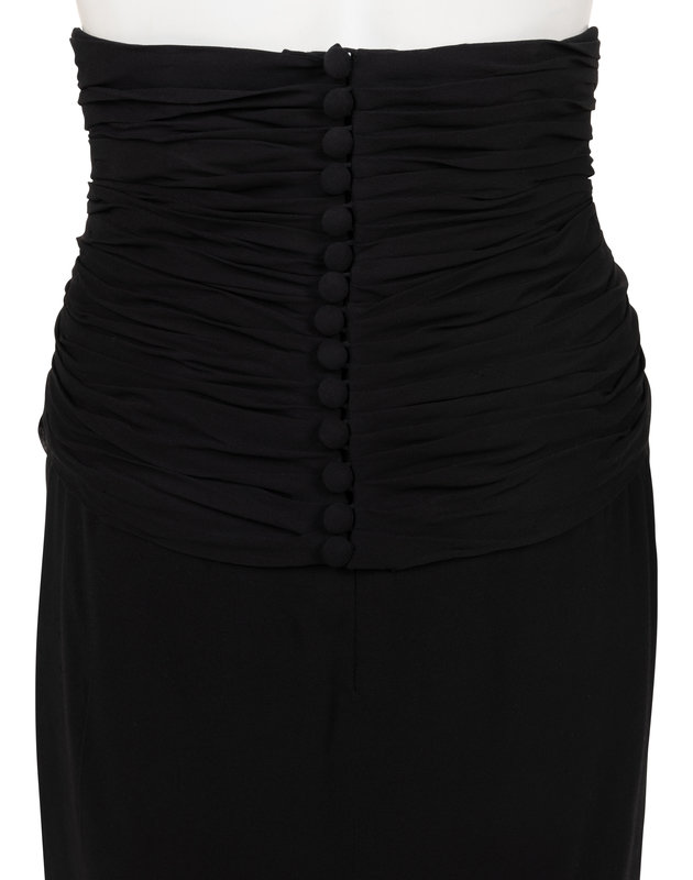 Black skirt that is ruched around the waist and then pleated down the skirt, and buttons going down the back.