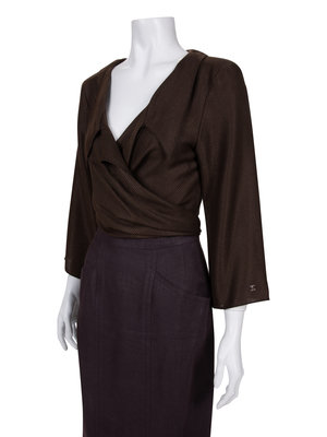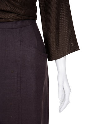 Brown rayon/linen blend novelty weave tie-front top with long rolled collar and straight fit sleeves; paired with a gray brown linen/wool blend twill paneled skirt with center back button closure.