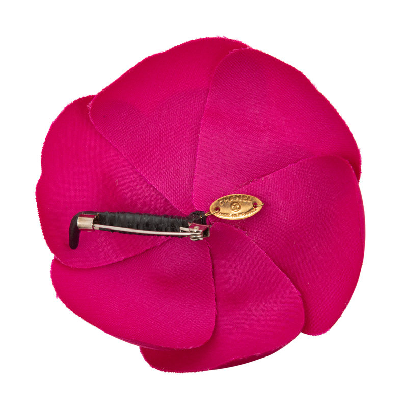 Fuchsia fabric camellia floral pin.