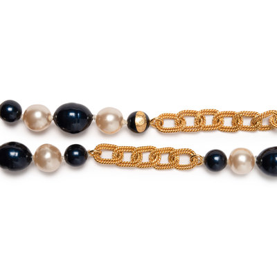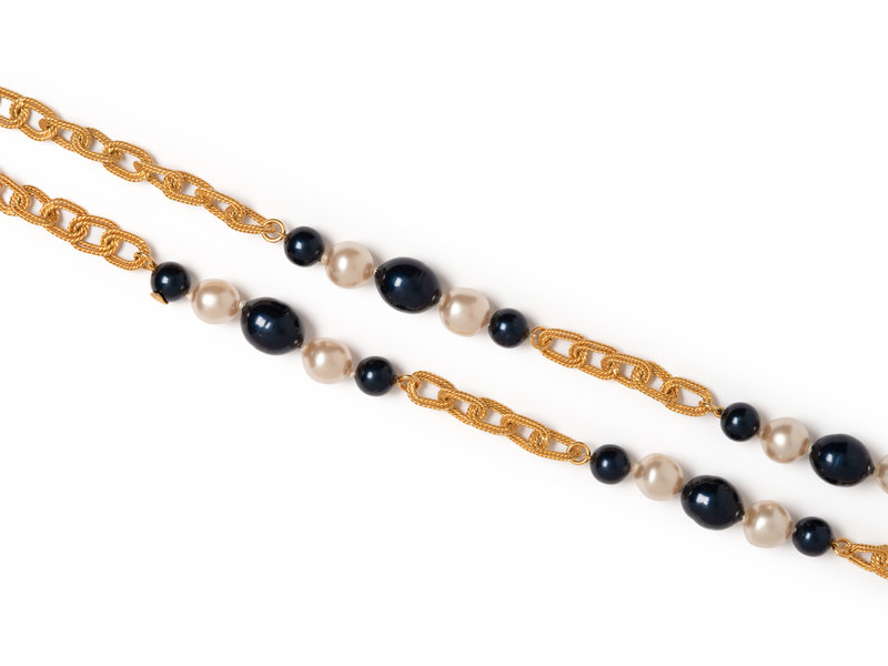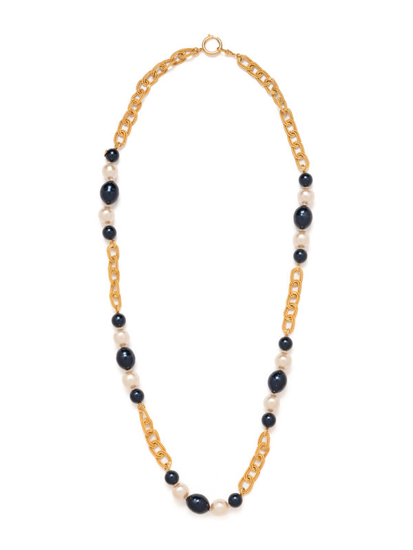 Blue and white faux pearl necklace on gold-tone rope molded metal chain. Collection 28.