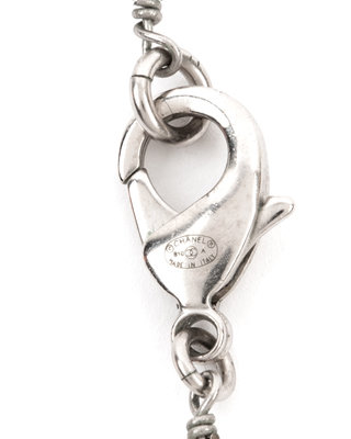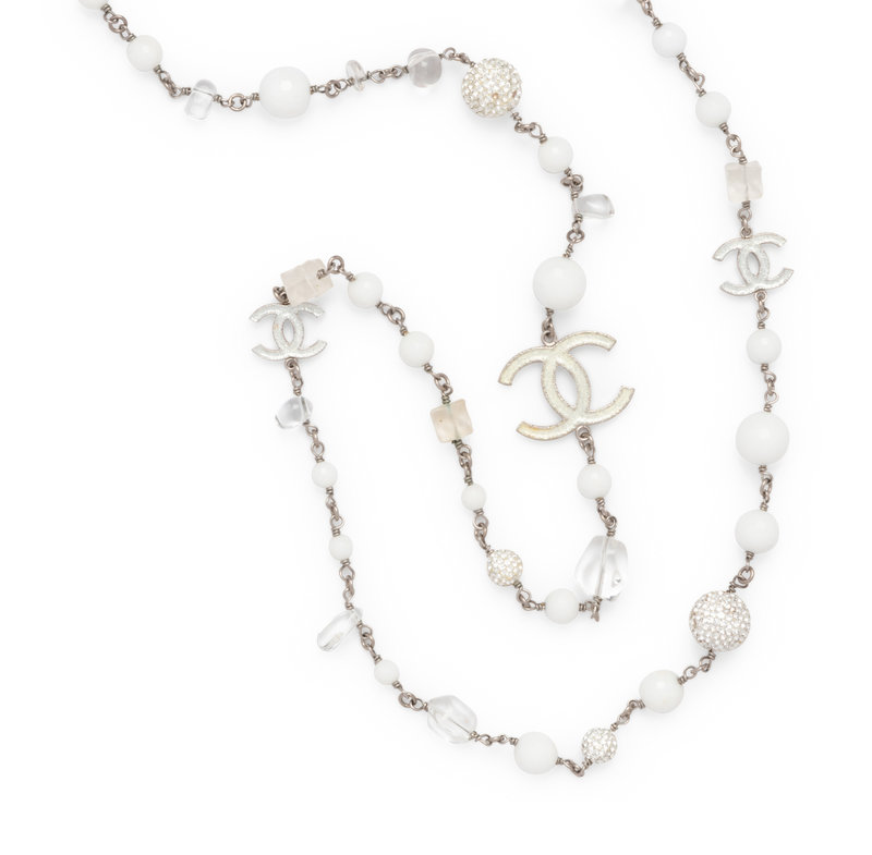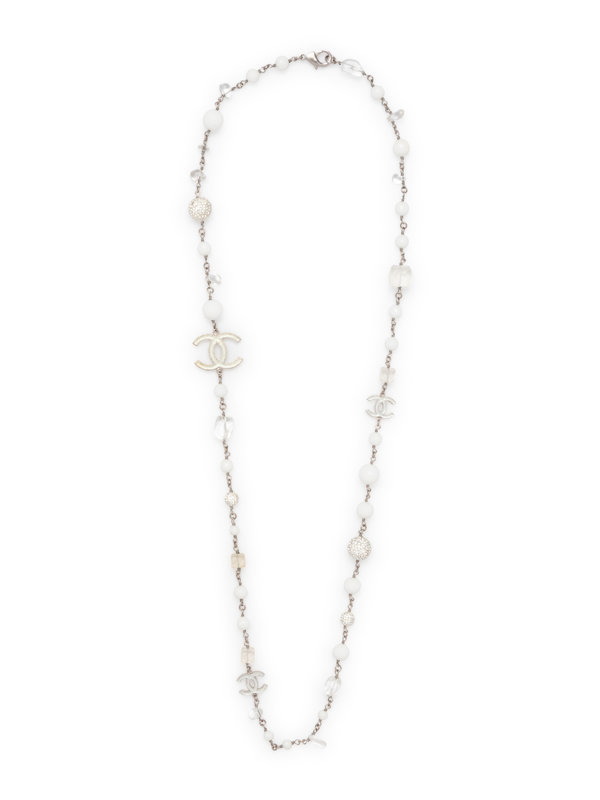 Silver-tone chain necklace with white faceted beads, clear glass beads, rhinestone beads, and CC logo charms. Dust bag included.
